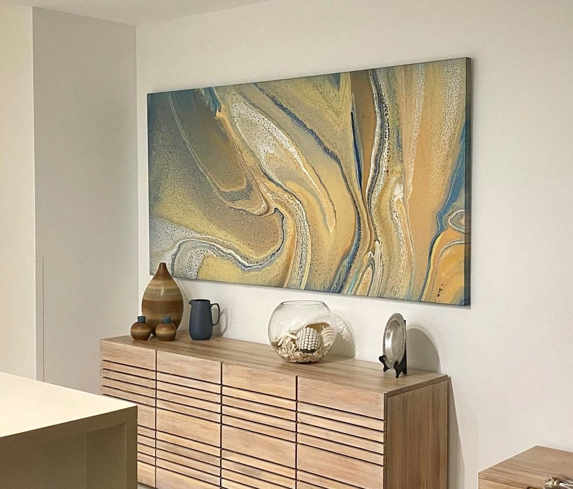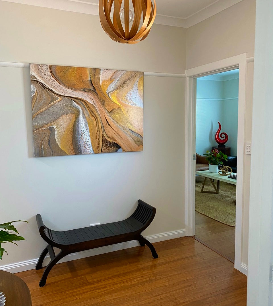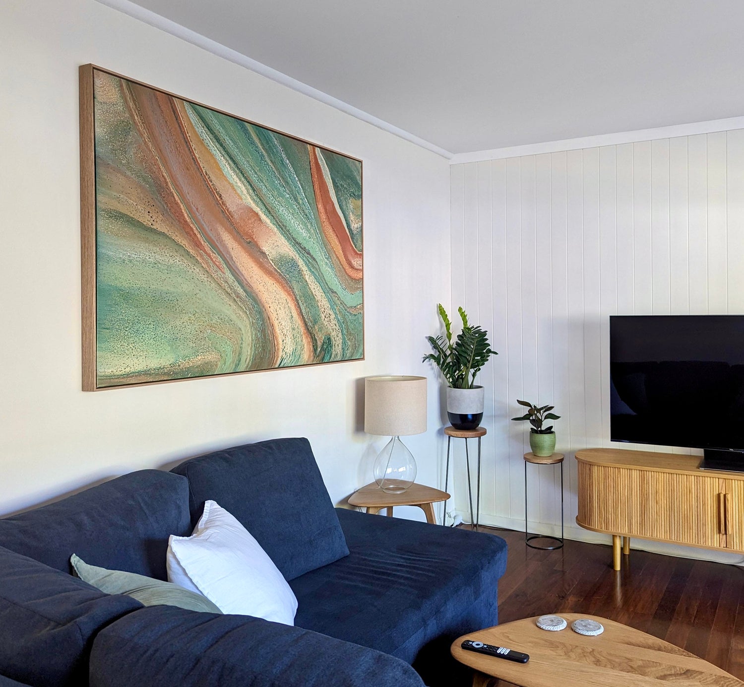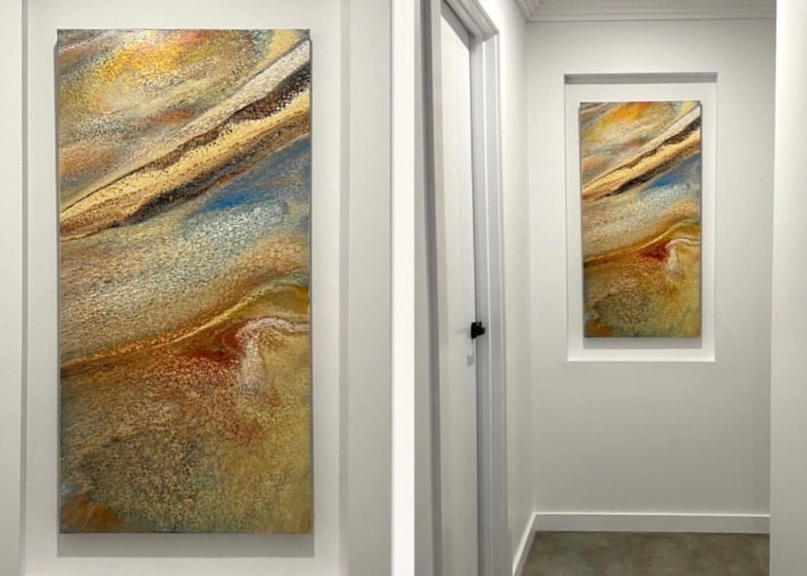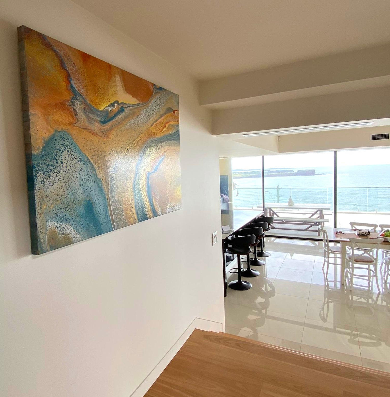 "It's up and it's beautiful 🤩. I've attached one pic and will send another which gives you a better idea of where it is. You walk in the house to view the ocean and the painting has the colours of inside and outside our home. We couldn't be happier to it up on our wall for our first Xmas in the new home with our families. Thank you again. We are already looking to put another one of your designs on another wall. 🥰"