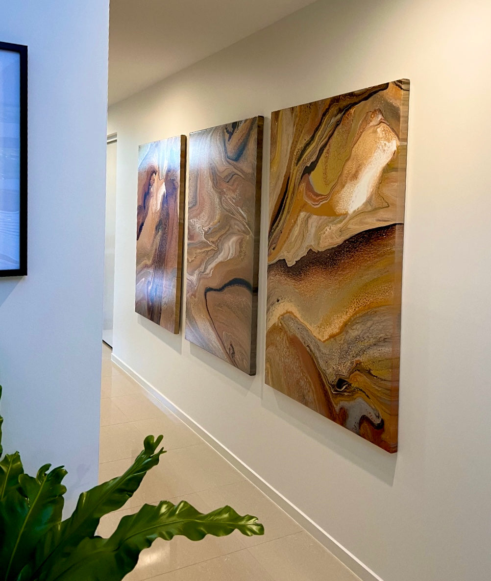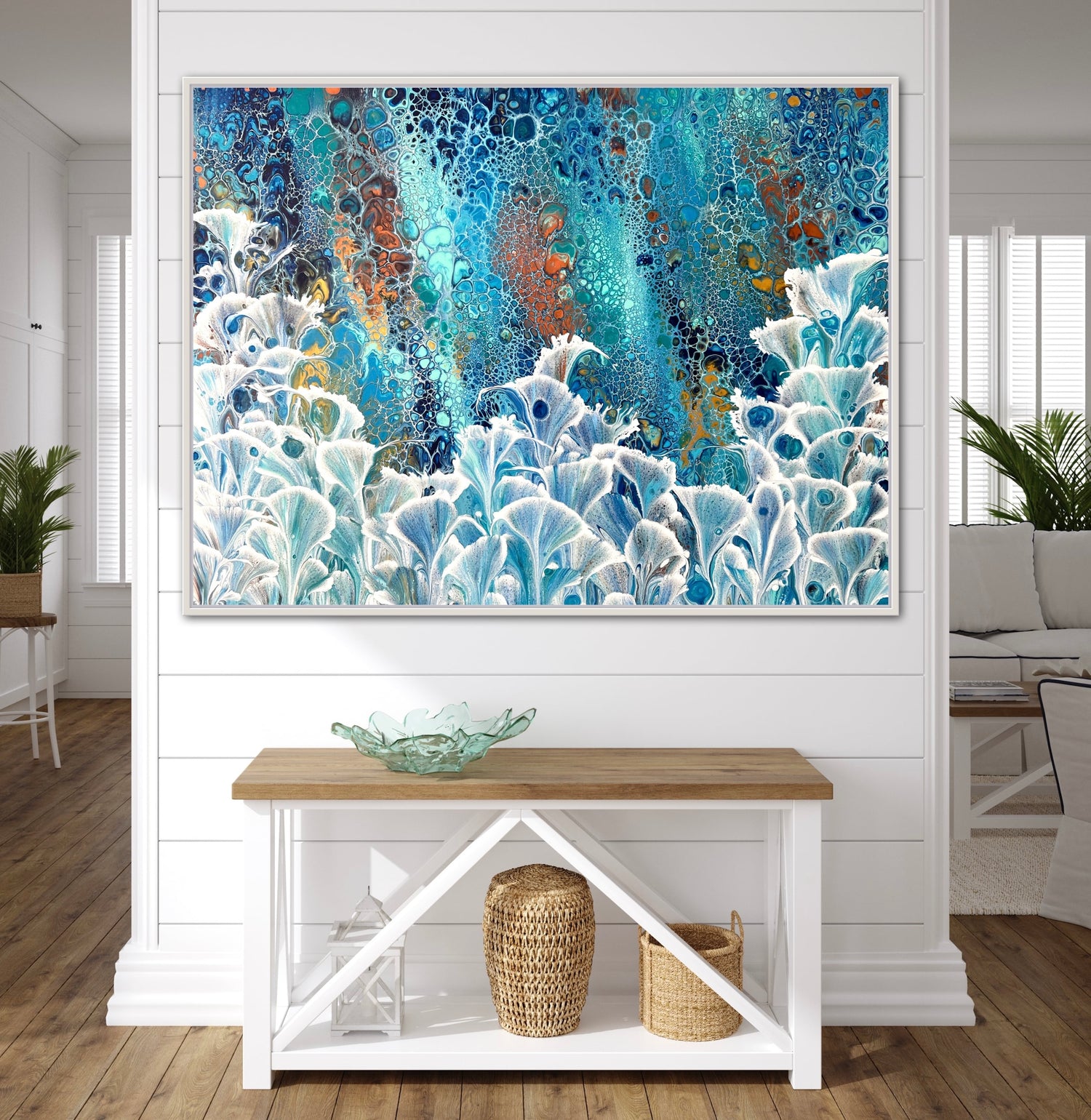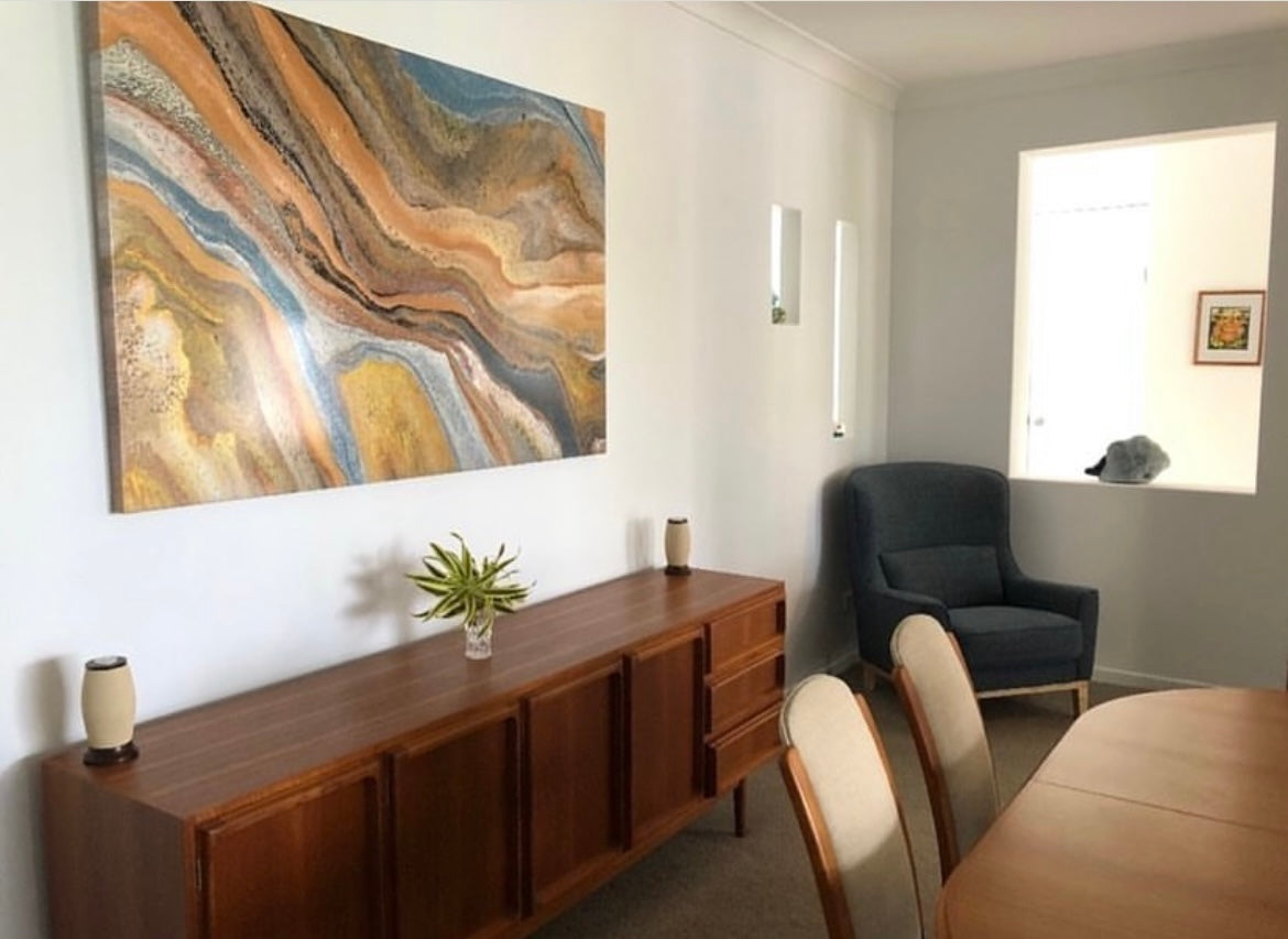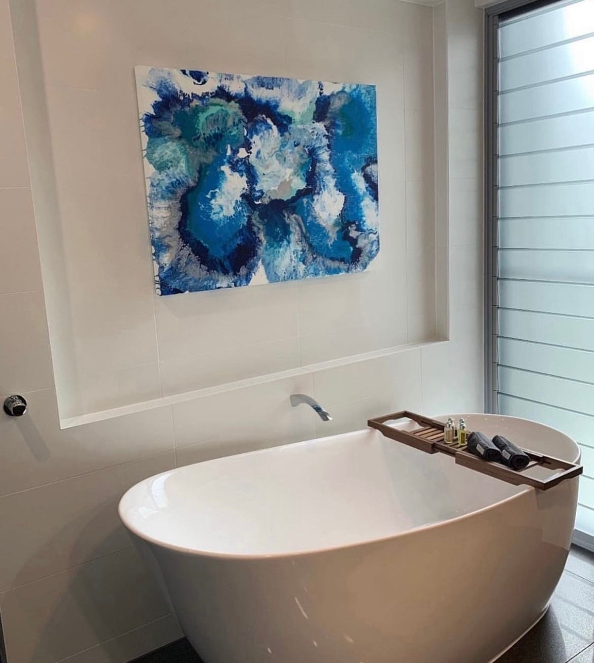 "It's up and it's beautiful 🤩. I've attached one pic and will send another which gives you a better idea of where it is. You walk in the house to view the ocean and the painting has the colours of inside and outside our home. We couldn't be happier to it up on our wall for our first Xmas in the new home with our families. Thank you again. We are already looking to put another one of your designs on another wall. 🥰"