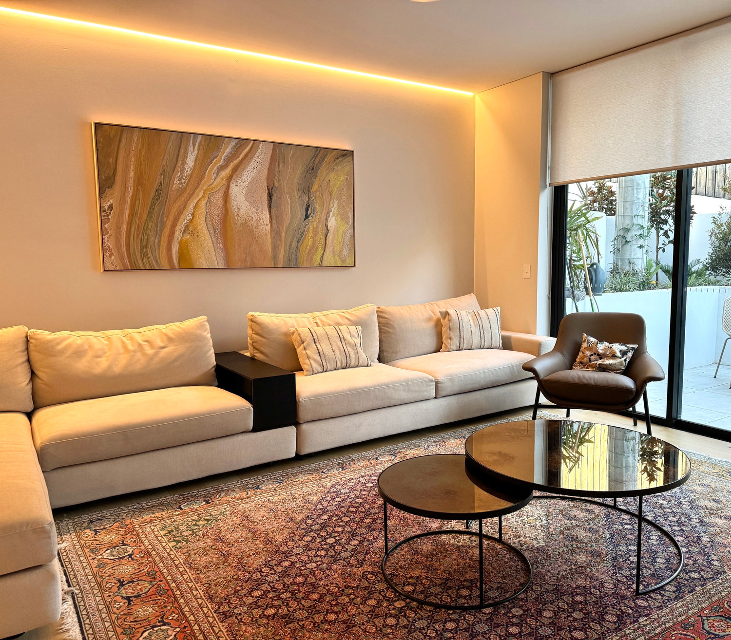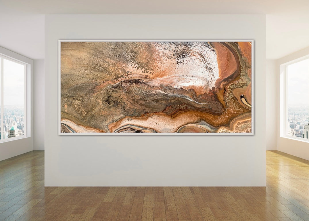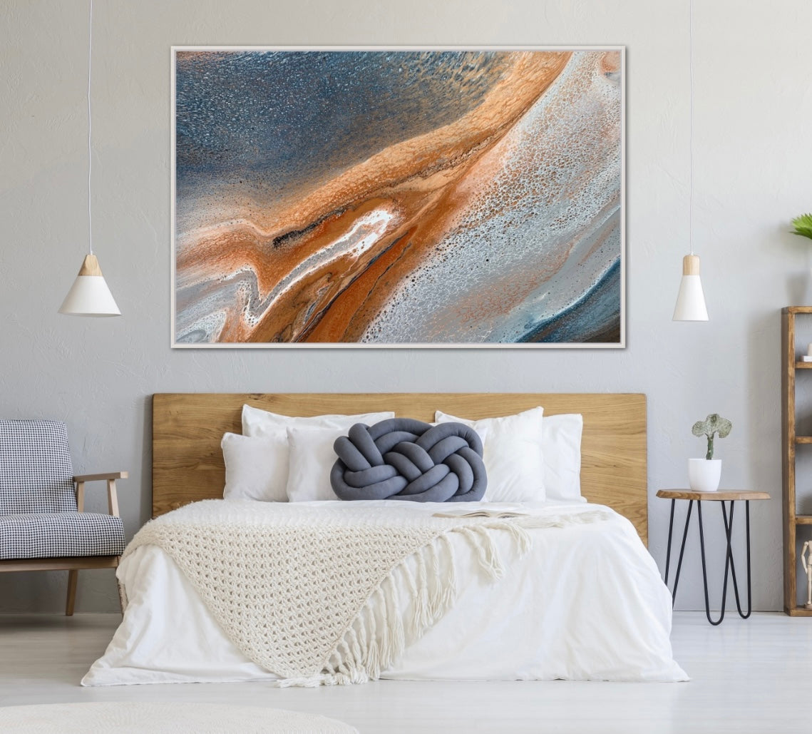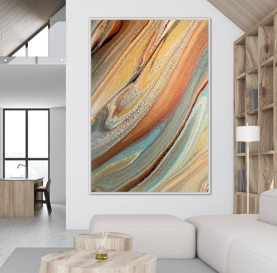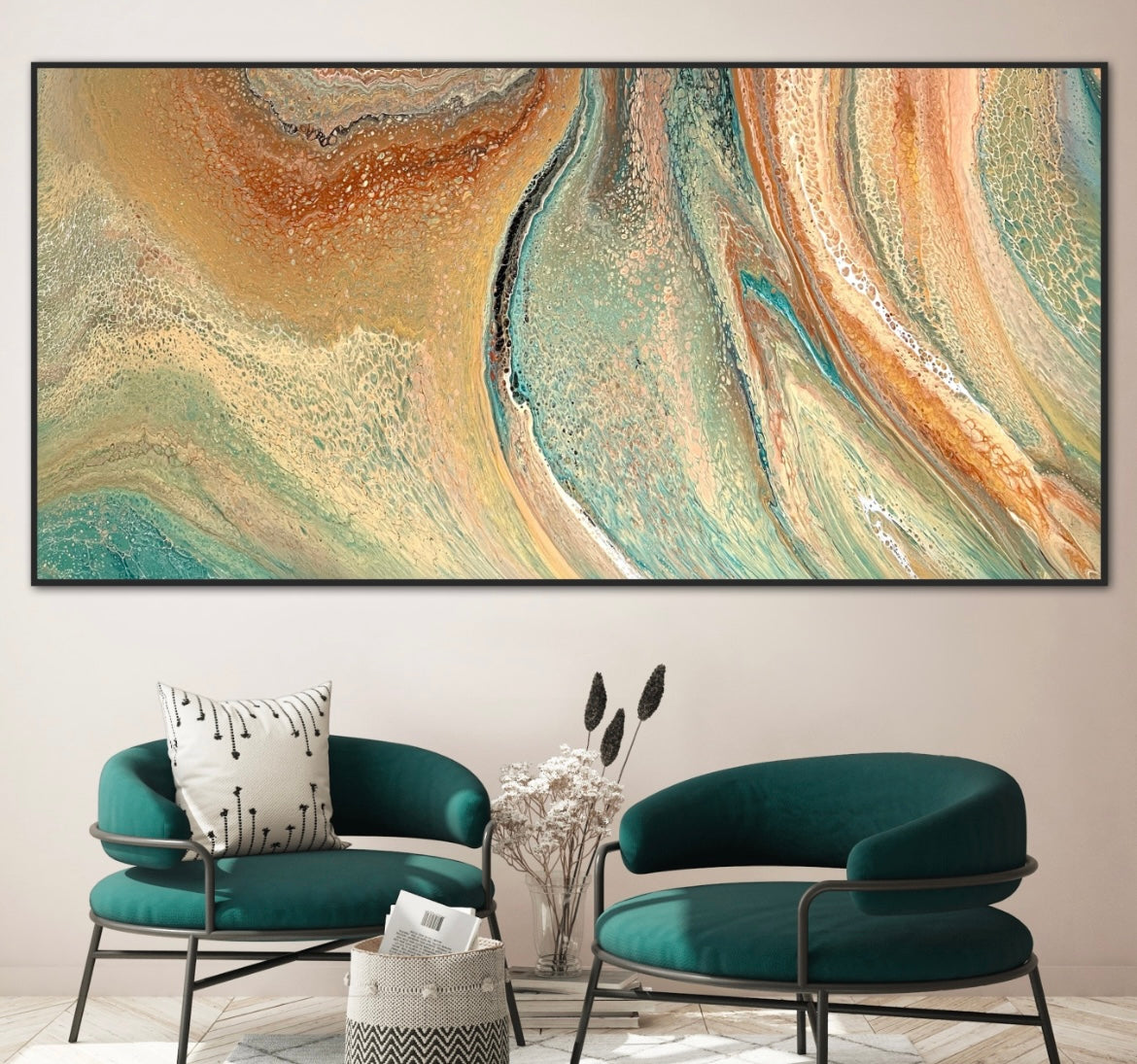 "It's up and it's beautiful 🤩. I've attached one pic and will send another which gives you a better idea of where it is. You walk in the house to view the ocean and the painting has the colours of inside and outside our home. We couldn't be happier to it up on our wall for our first Xmas in the new home with our families. Thank you again. We are already looking to put another one of your designs on another wall. 🥰"