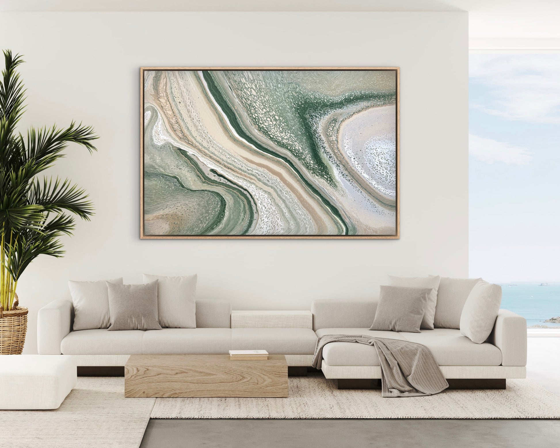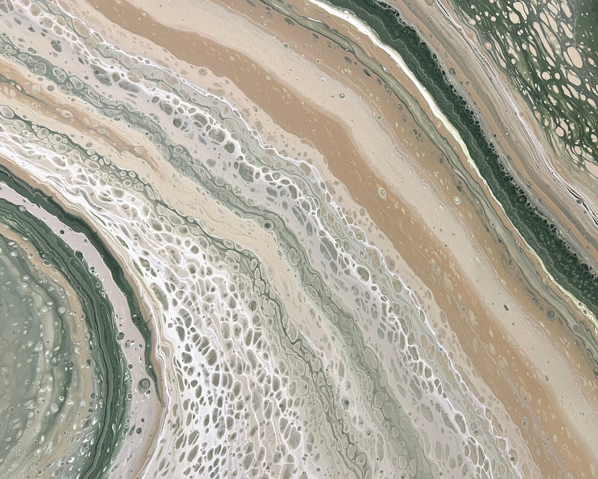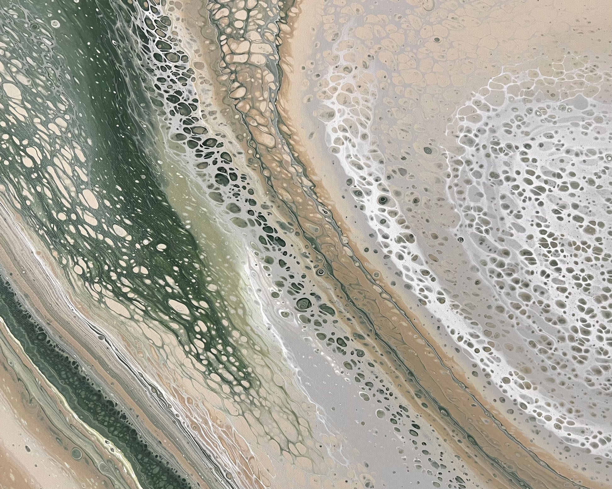 Soft layers of mineral greens, cream, sand, and stone flow across the surface in gentle, organic movement, with occasional silver highlights. The palette feels calm and grounded, offering subtle depth and quiet variation throughout.