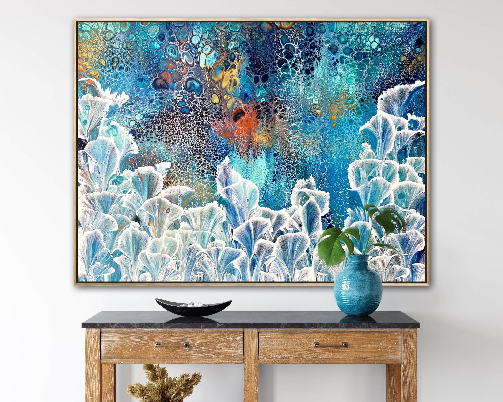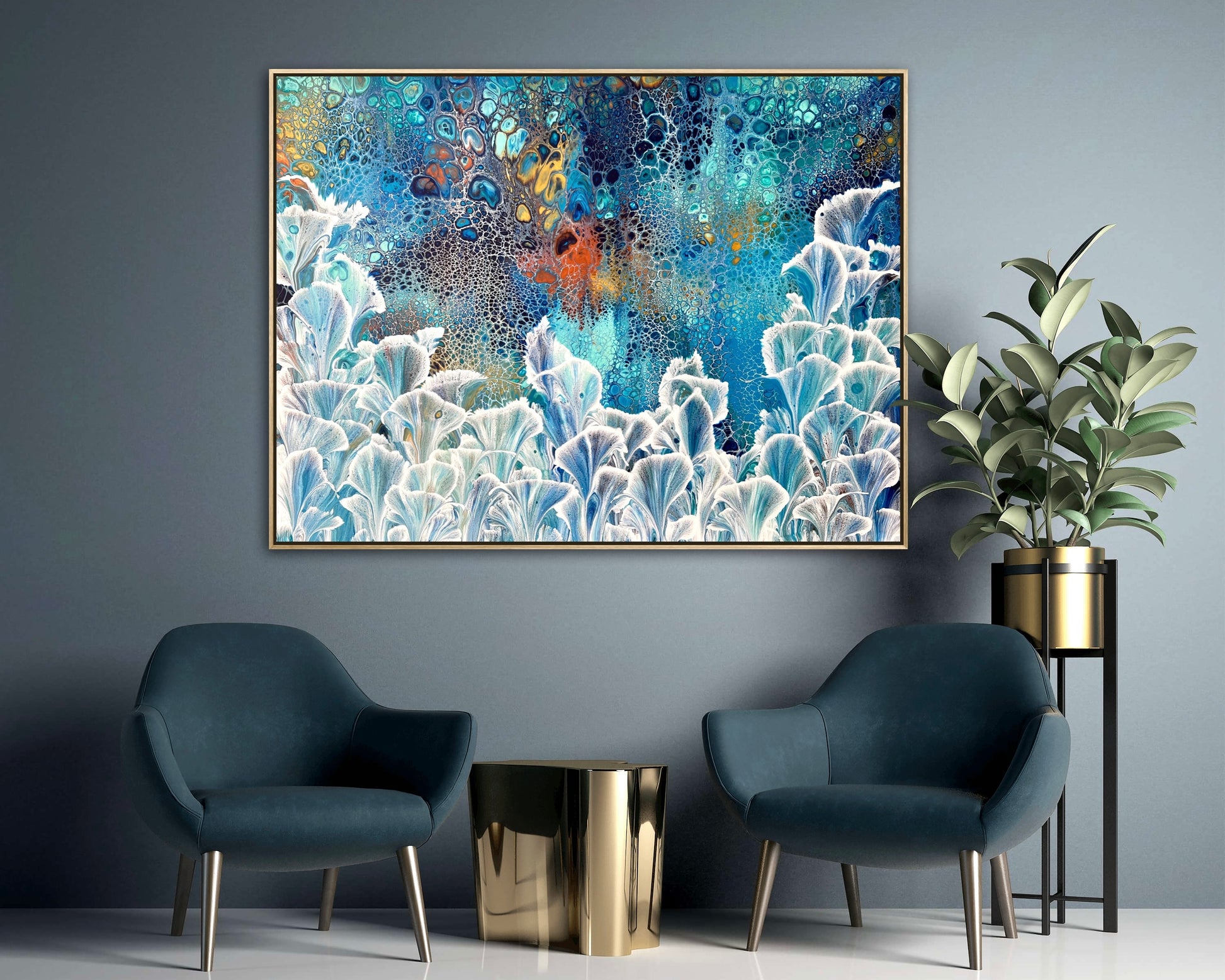 Cascading Valley is inspired by nature and depicts in abstract Calla Lilies growing tall and in abundance with lush flora behind. Created using various techniques combines to allow increase flow, interaction and separation of colours to create organic and interesting patterns where pops of metallic gold and copper with various blues and greens can be seen emerging from underneath. Each flower is individually created and layered and no two are the same.