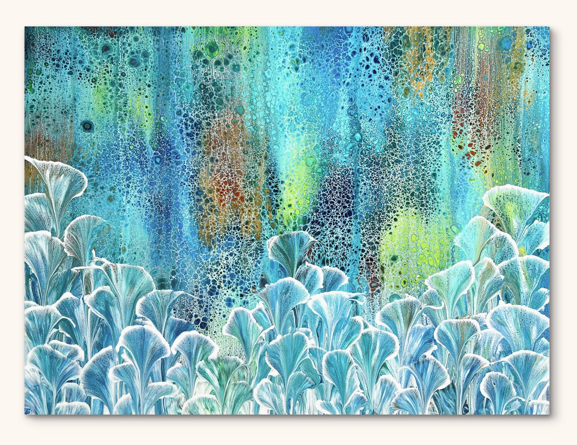Layers of blues, greens, and subtle metallic copper and gold intertwine to create depth and movement, with each flower individually formed so no two are alike. The background blooms with intricate cells and organic patterns, making the piece as captivating up close as it is from afar.