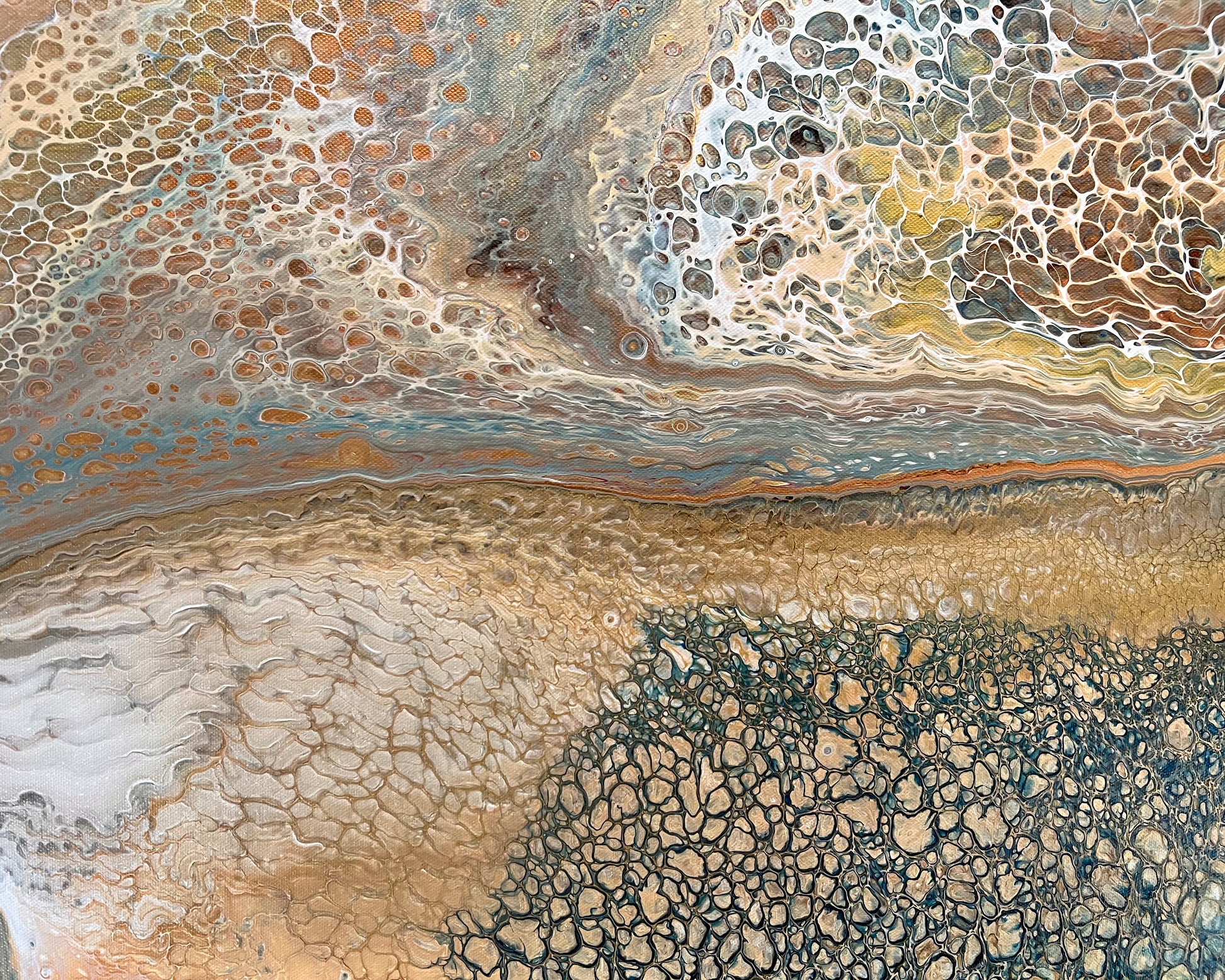 A gorgeous variety of acrylic pigments were used including metallic yellow and warm gold, rose gold, cream, bronze, copper, silver, blues, black and white.