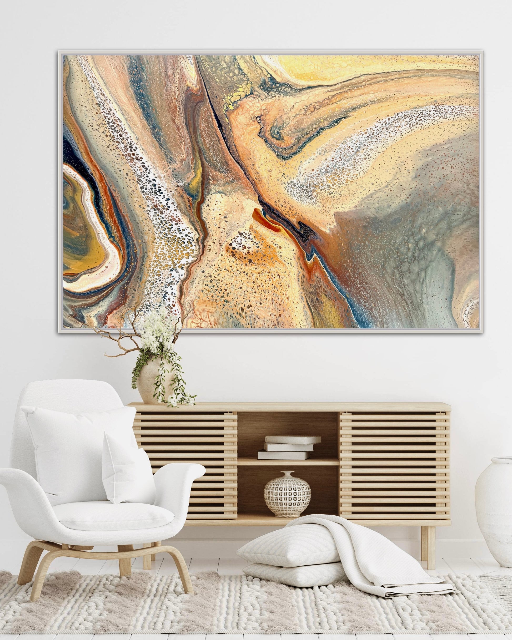 'In situ' photos have been included to help with visualisation of the artwork in your home. In situ photos provided were created using the ArtStage app and may not be perfectly to scale. This being said, every effort has been made to represent the size of the art accurately but please read the dimensions of the artwork to ensure it fits your space perfectly. Where provided, photos of framed art are for illustrative purposes only.