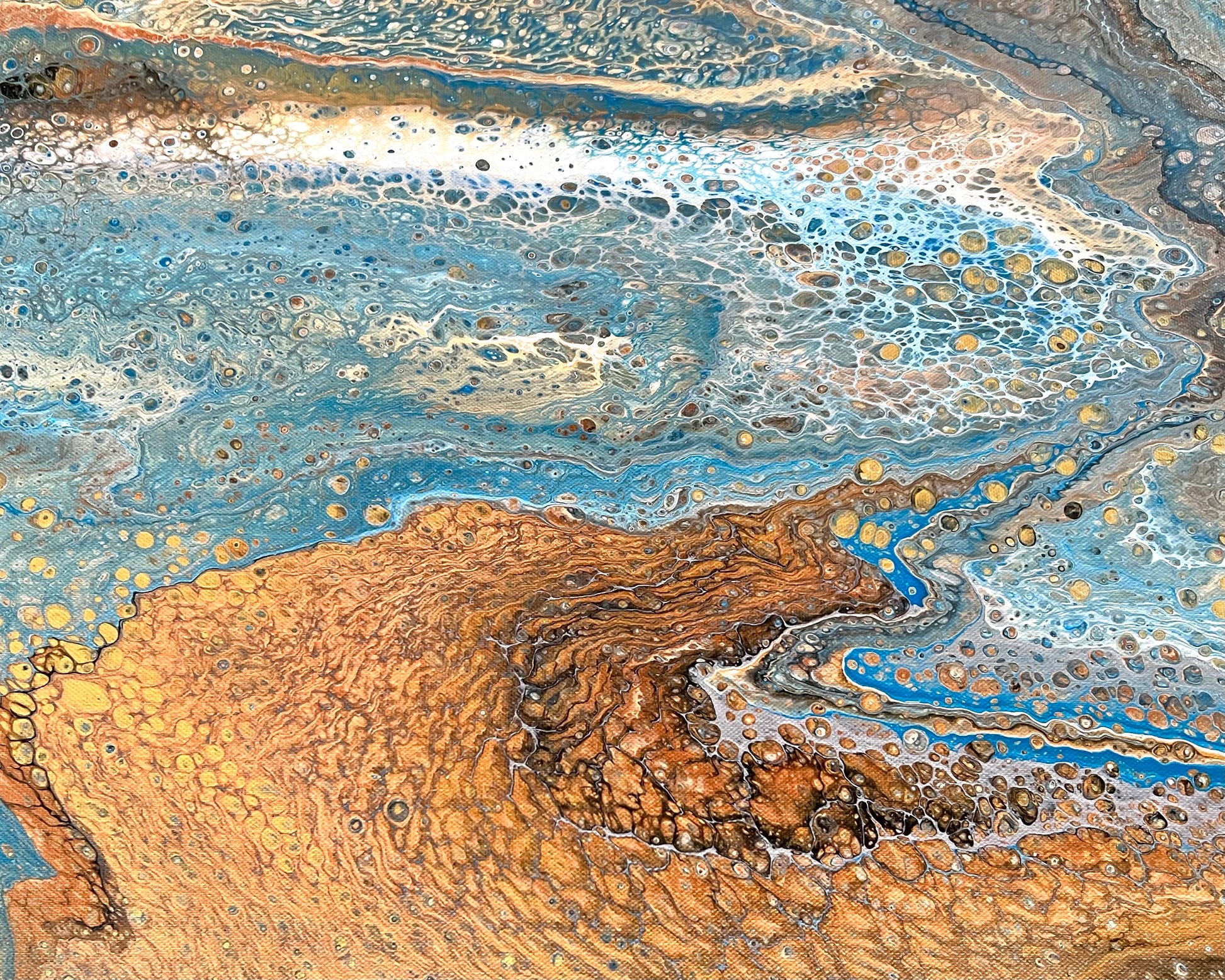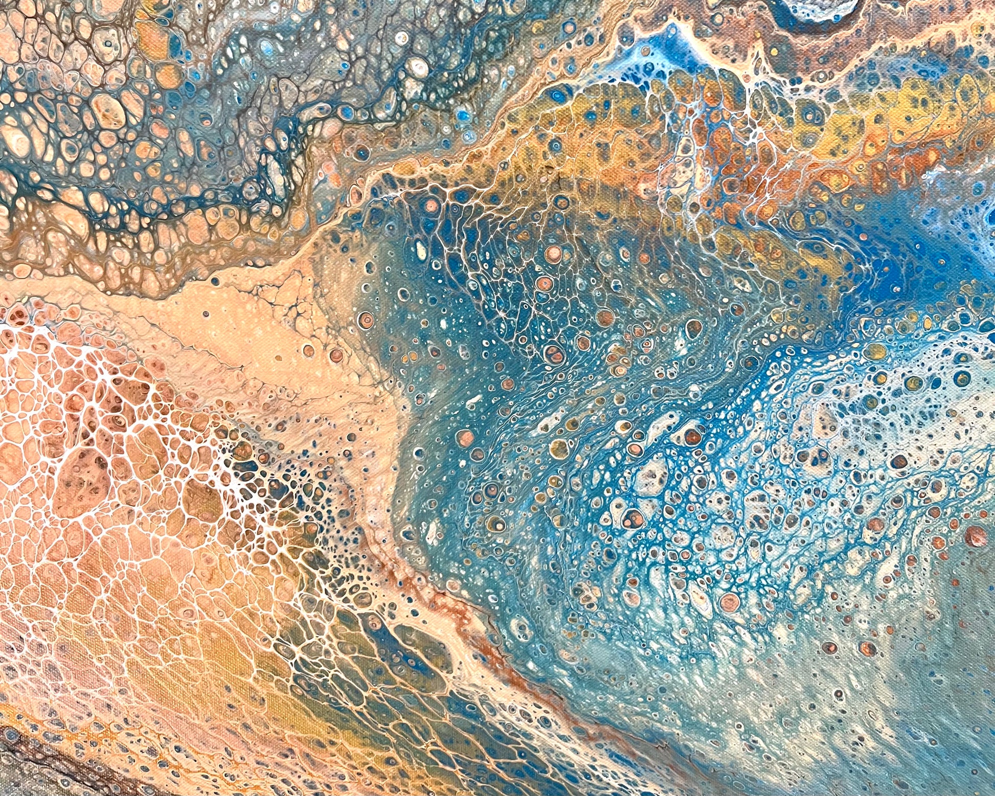 Flowing Terrain was created using various techniques combines to allow increase flow, interaction and separation of colours to create organic and interesting patterns where pops of colour can be seen emerging from underneath. This added dimension adds lace and cells to the artwork creating an interesting and one of a kind painting that can never be replicated.