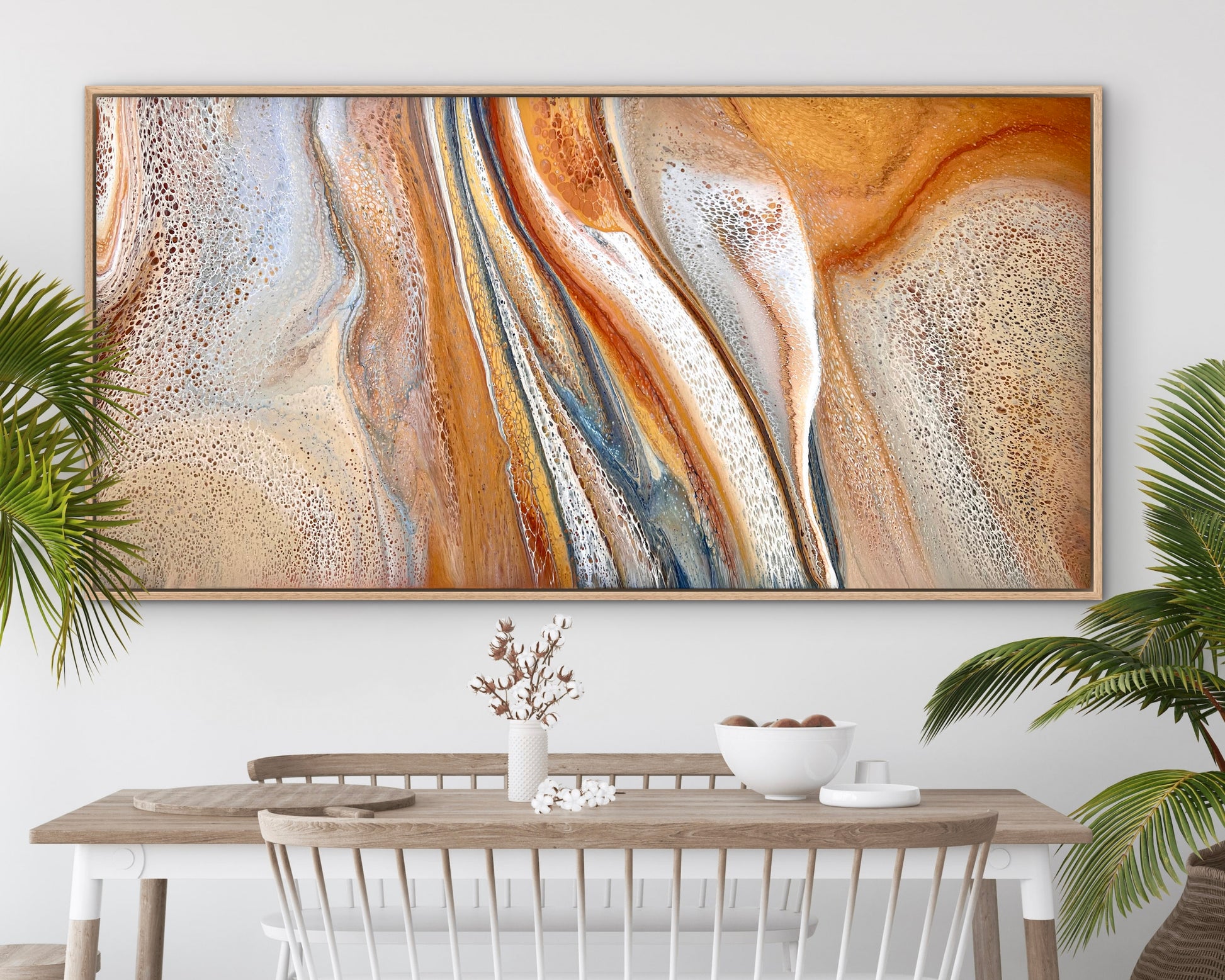 Warm and yellow golds, bronze, copper, and touches of rose gold move seamlessly with silver, grey, and soft creams. Deep blues and grounding blacks flow through sandy neutrals and white, creating a balanced palette that shimmers with subtle metallic highlights. This artwork comes alive under shifting light, revealing depth and movement throughout the day. A striking statement piece, finished with archival satin varnish for lasting colour, subtle lustre, and excellent UV protection.