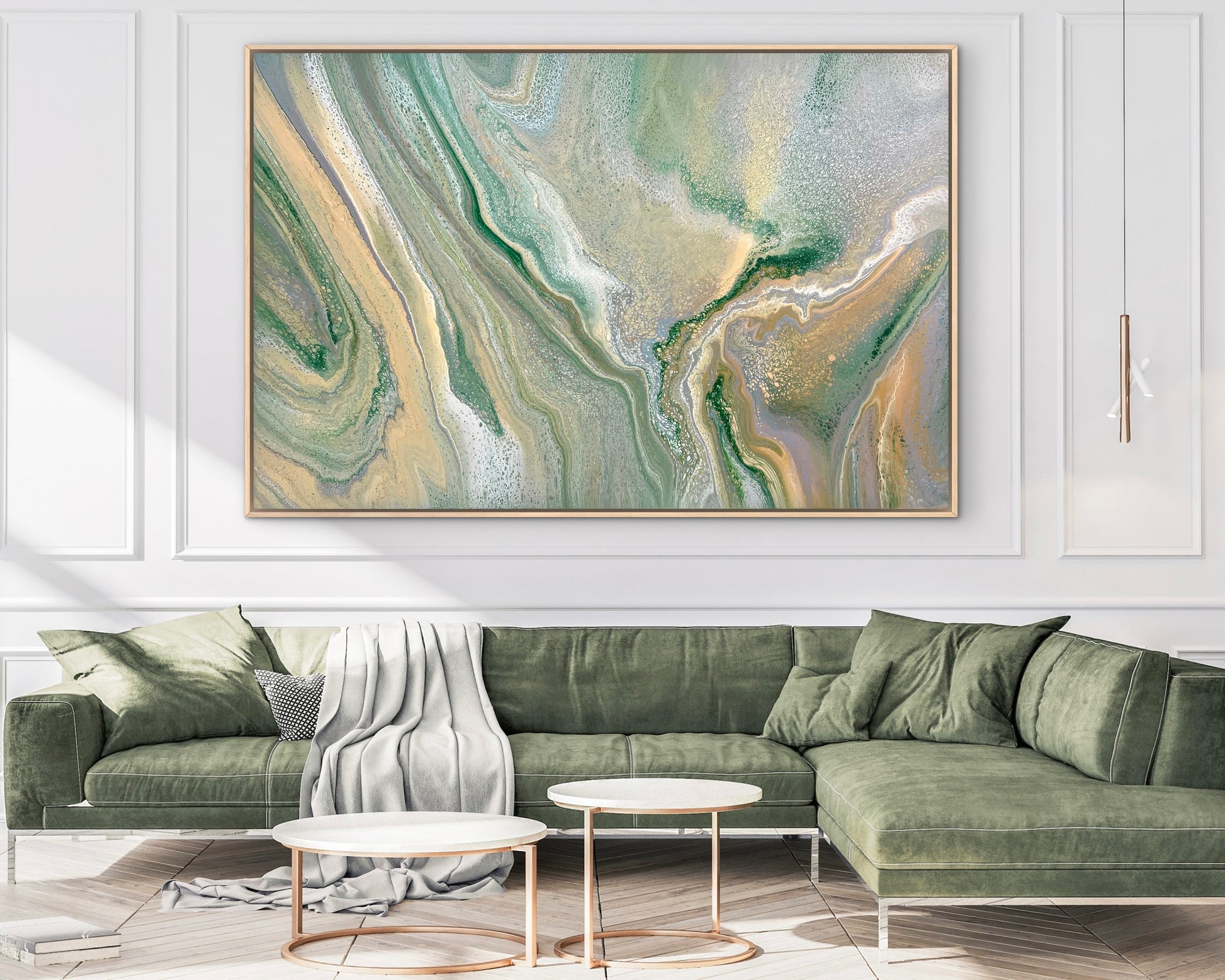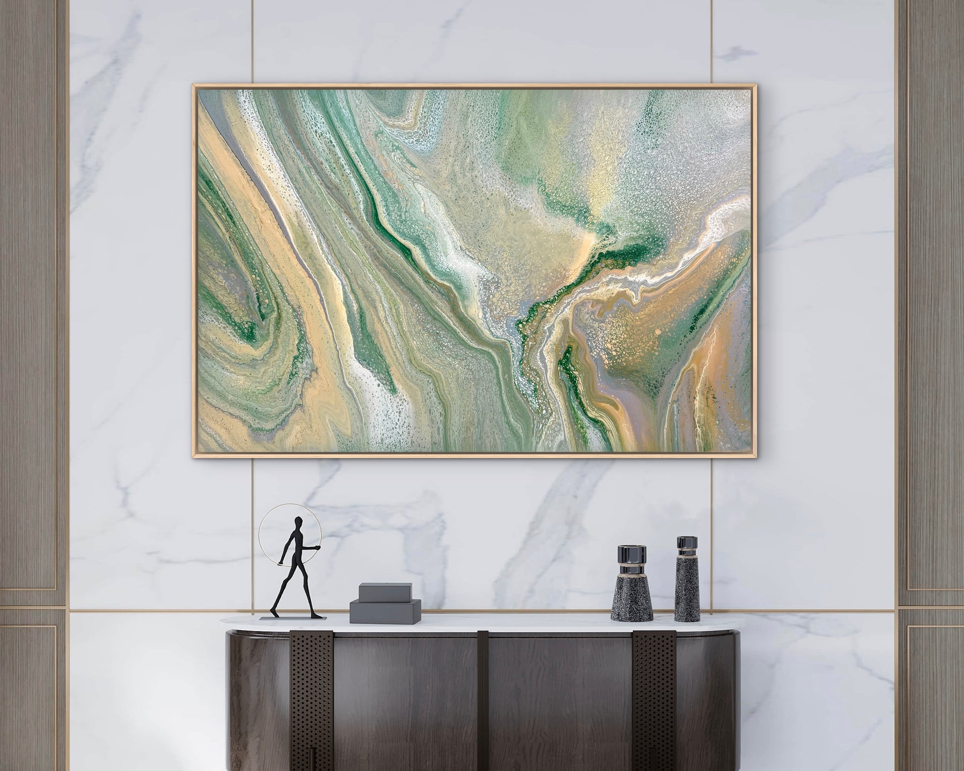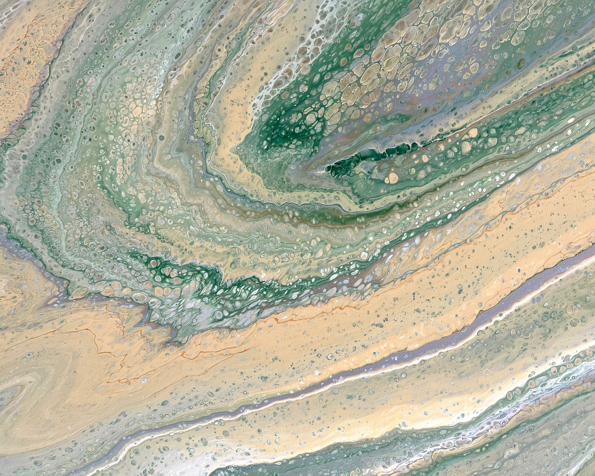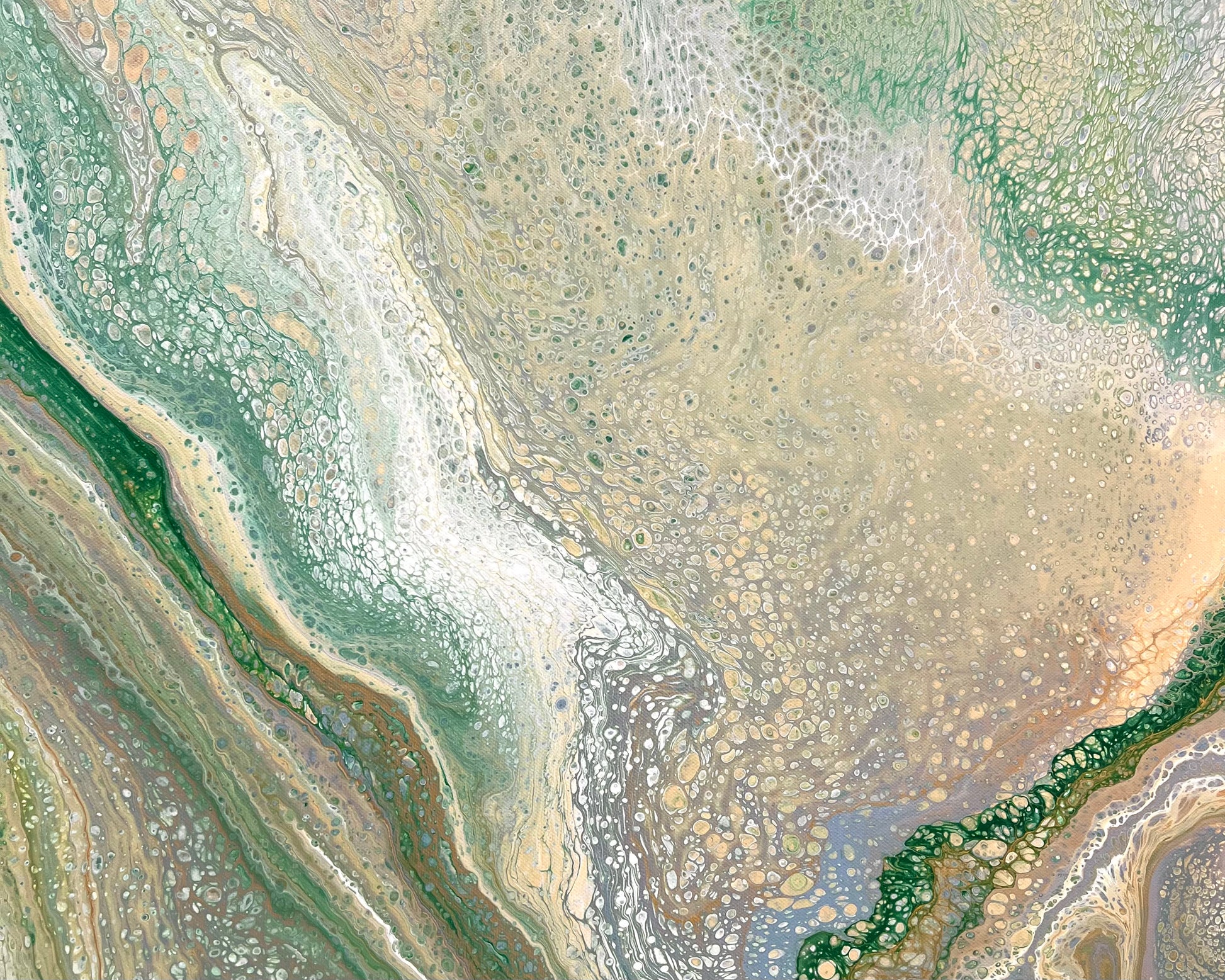 Mineral greens, muted sage, and warm earthy tones blend together, touched with silver, greys and white lacing that create delicate organic patterns throughout the surface.