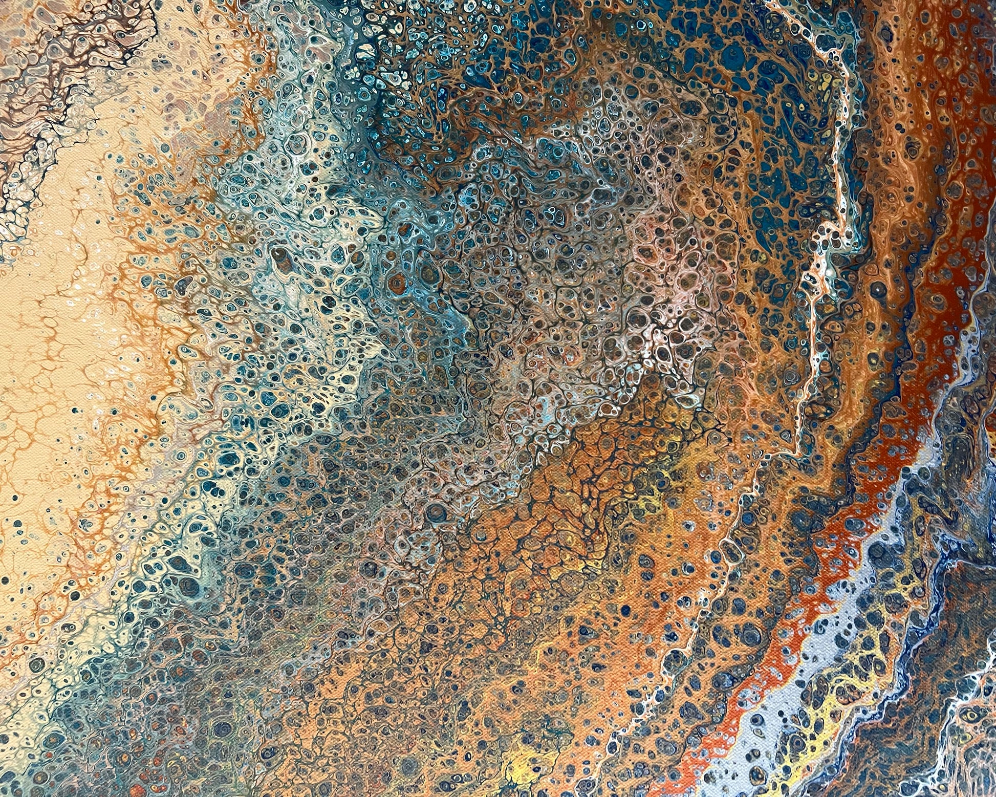 Natures Vibration was created using various techniques combines to allow increase flow, interaction and separation of colours to create organic and interesting patterns where pops of colour can be seen emerging from underneath. This added dimension adds lace and cells to the artwork creating an interesting and one of a kind painting that can never be replicated.