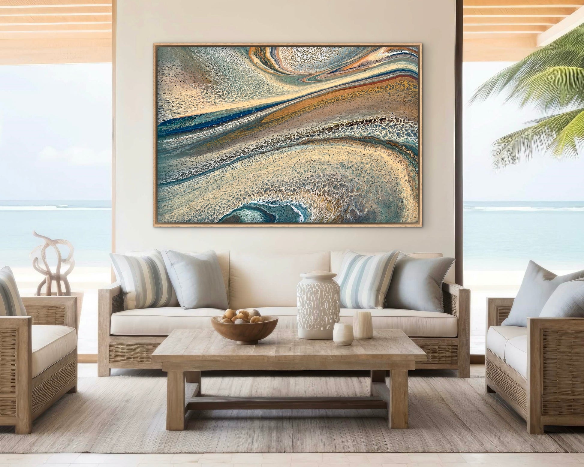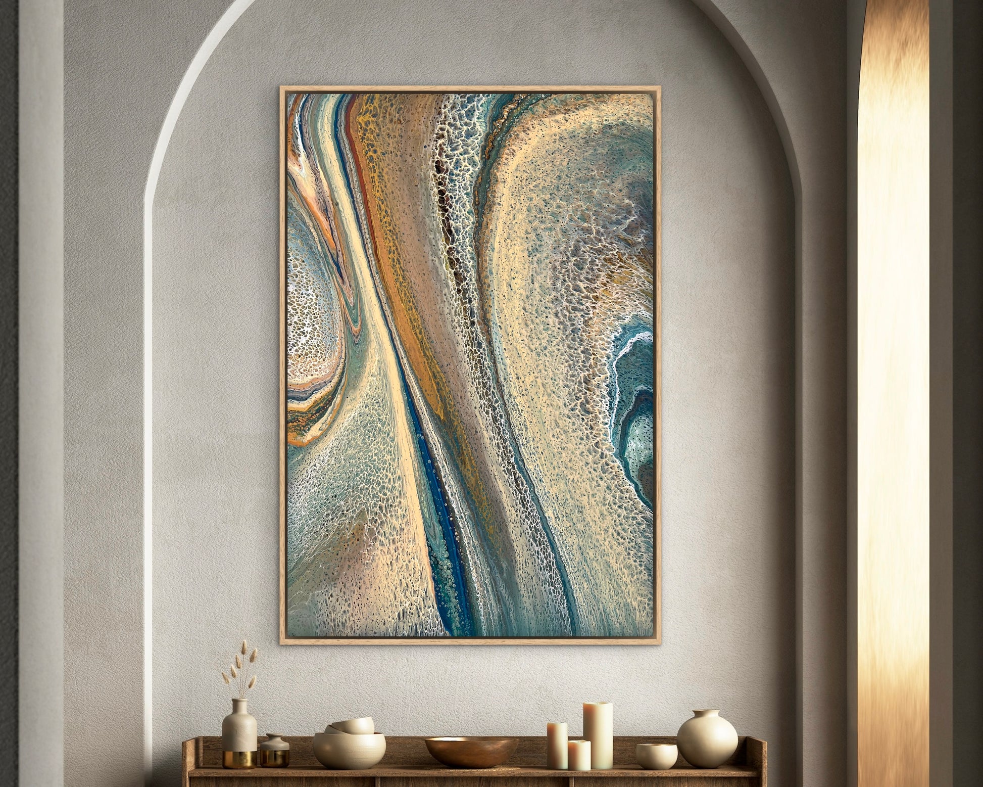 Created using layered techniques that enhance the flow, interaction, and separation of colours, the composition reveals intricate lacework and subtle shifts in tone where hidden hues emerge from beneath. These delicate transitions give the artwork dimension and movement, creating an organic, one-of-a-kind piece that can never be replicated.